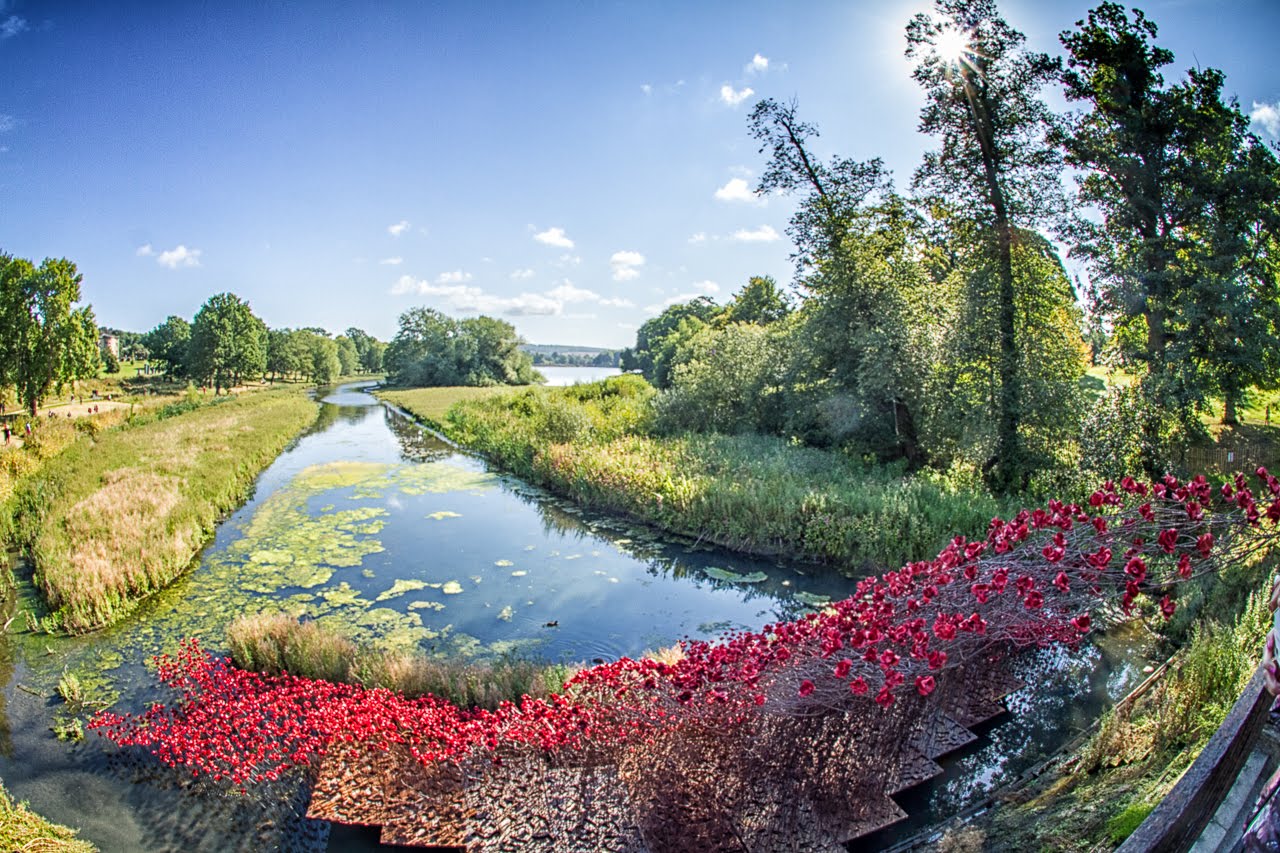 Here we are looking down from the bridge over the top of the poppies towards the edge of the display. The light patch to the right go the photo is the reflection of the sun in the water where there is also part of the base of the structure of the sculpture. I suspect that had the water level in the lake had been normal that the base would have been under the water and these poppies below would have had there heads just poking out of the water.