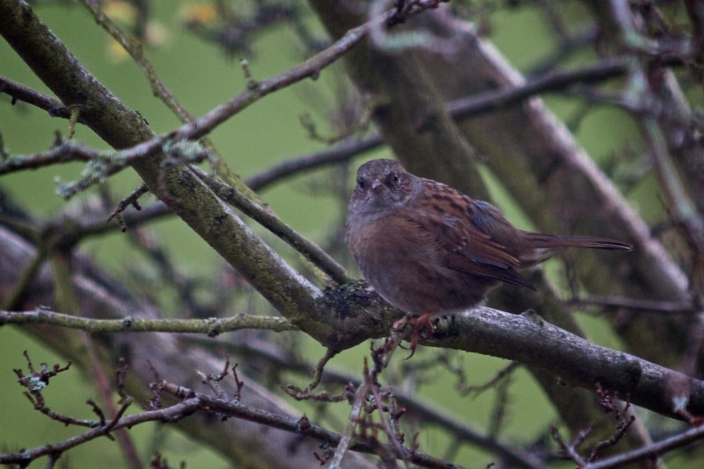 This next shot was a little brown bird (LBB) which was sat in the hawthorn tree away from the feeder and it's taken me a while to figure out what it is. Using the RSPB bird identifier I narrowed down to one of a few female birds or possibly a Twite. Although on this shot it's difficult to see but the beak was too long for it to be a Twite and anyway they are quite rare so unlikely to be in my garden. Finally I think I've found a positive match and I'm almost sure that it's a juvenile Robin.