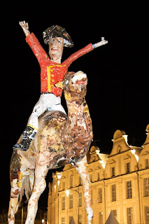 We went to a lovely Italian restaurant for dinner, which was very nice but quite expensive. After dinner I decided to take some more photos or Arras at night while Lynne watched some television. From our window we had seen this strange thing being moved about the square so I thought I needed a photo. So it looks to be Napoleon in Egypt, on a camel, just like at the museum. How odd.