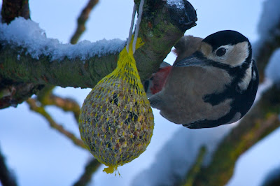 I've fallen behind on posting my recent photos but today I had an unexpected visitor into my garden so I felt I needed to post it straight away. I was WFH (working from home) because I couldn't get into the office because of the snow. I've made sure that there is always food out for the birds and as you may have seen in my previous posts I get a fair variety of wild birds coming to feed. As I was returning to the lounge from the kitchen with a well deserved cup of coffee I spotted a medium size bird go past the window. I crept up to the window and saw this lovely woodpecker hop onto the branch above one of the famous fruity balls. I ran out to my study, picked up my camera, put on the long lens and quickly checked all the settings before returning to the lounge window to get this first shot.