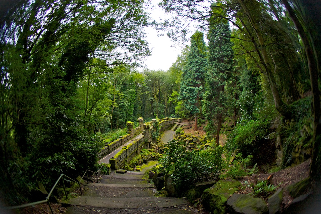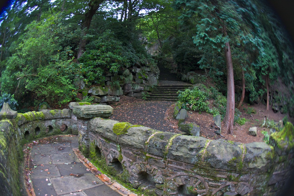 At the other end of the bridge there are step up to where the original cascade used to flow under a little bridge down a fifty foot cliff face and into a deep pool. In the centre background of this photo you might be able to make out apart of the cliff face. This photo and the next two were also taken using the fisheye because I wanted to get the very wide angle shots and I quite like the distortion around the edges.