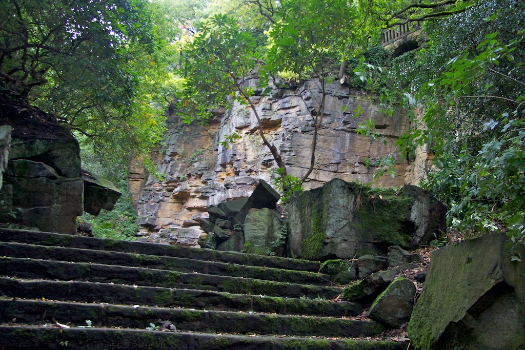 I had probably spent a good half to three quarters of an hour down here taking photos and opening and closing the gates so I think I had exhausted the subject for today. Next time I come here I might take some closer up shots to capture more of the detail in the stonework. I took this final shot of the entrance as I started up the path towards the site of the old cascade. I included the old bit of stone in the foreground to add a bit of depth to the shot.