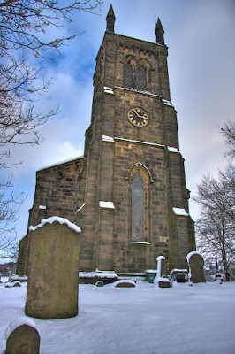 As I've been unable to drive anywhere because of the snow I decided to go for a walk from my house. First stop was the village church in New Mill. It's quite a nice church which I have photographed several times before but not in the snow before. I quite like the composition from this position in the graveyard so there is the back of the gravestone in the foreground. There were just a few patches of blue in the sky but as you can see by the clock it is nearly 3pm and will be getting dark in the next hour or so.