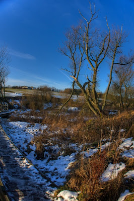 It was a beautiful day on the walk with no wind and a clear blue sky. Still some of the Christmas Eve snow was on the ground and pretty much frozen solid. One of the other things that the Lensbaby Fisheye has is very little protection from glare so on this next image I've used that characteristic to enhance the sun and its refection.