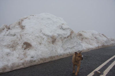 Evey was a bit bemused by these big piles of icy snow that had been built up by the diggers attempting to clear open the road.