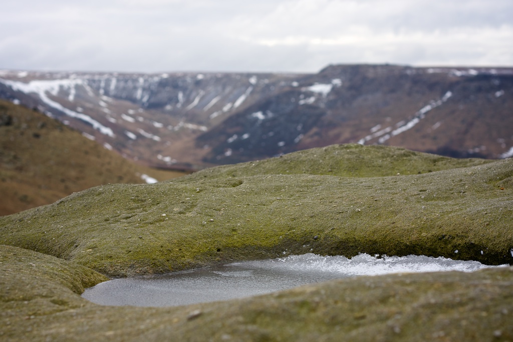 I climbed up the other side of the rock to take this next photo of one of the water holes. As you can see it was frozen solid. Legend has it that washing your eyes in the water from one of these holes will cure many eye diseases. Not today though. You might notice that the background in this shot is the same as from the first shot in this post, looking up the Chew Valley.