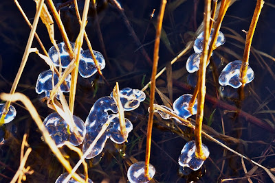 The reservoir was no longer frozen over but it is still very cold overnight and my eye was caught by the way the ice had formed on these twigs sticking out of the water. As the ripples moved along the surface of the water they lapped up onto these blobs of ice which were a centimeter or two above the water. The sun shining on them and lighting them up in a beautiful way. Now I wish that I had a macro lens so I could get really close up and make an image concentrating on a single blob of ice.