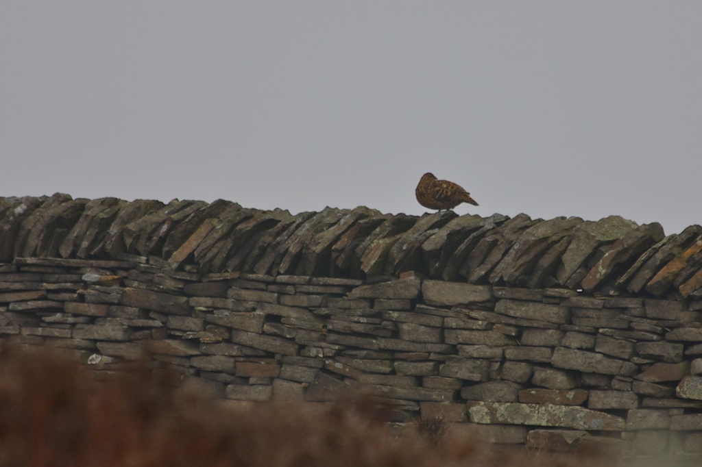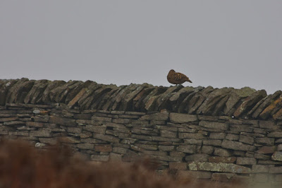 I parked in a little lay by near an old lane (Magdalen Road) where I have seen Curlew and Lapwing before. I could hear the birds I was searching for and also the grouse who live here all year around. My first sighting was of a couple of grouse sat on the wall and I managed to get this first image before they flew off.