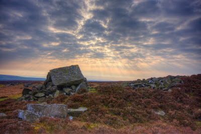 When I set of from home the sky was a bit cloudy but it looked as though it was going to brighten up. When I arrived at Stanage the clouds had increased and was just letting little shafts of light through. The first two images were taken on the top of the edge in an area where there are a few big rocks. I have used the rocks as a foreground and am looking into the sky to see the God rays.