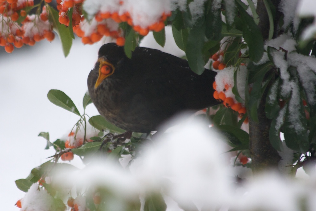 Here we have a blackbird feeding on the bright orange berries from the bush. Not a particularly good quality photo but I just liked the way you can see the berry just before it disappears. I have a series of shots with the bird having a couple of berries from the bush but this was my favourite.