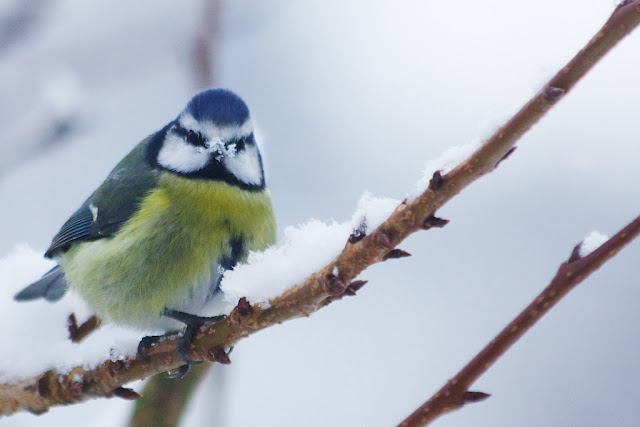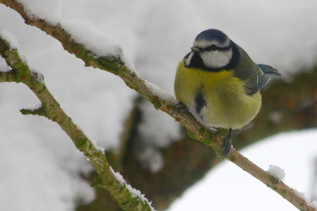 This little blue tit was eating snow, I guess because all the water about is frozen. I just thought it looked very amusing with the snow all around its beak.
