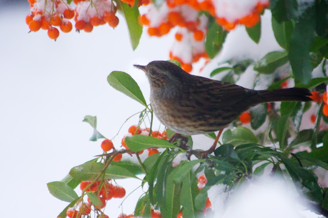 The first video was taken after the first small amount of snow and shows the feeder with the orange berried bush behind and then one of the balls. Towards the end of the video is MacKinnley the cat from down the road. He's a bit of a bully, but quite a magnificent cat.
