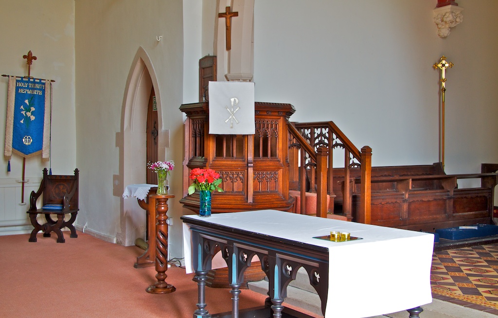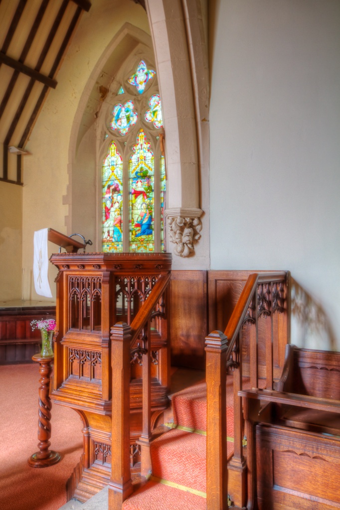 A different angle on the pulpit with the stained glass window behind. It looks like the paintwork on the arch is suffering from a bit of damp coming in and could do with touching up.