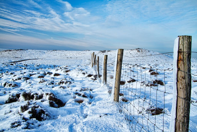 Another leading line photo with the fence heading off towards the TV mast. We are looking back from the direction we came and so our footprints echo the line of the fence.