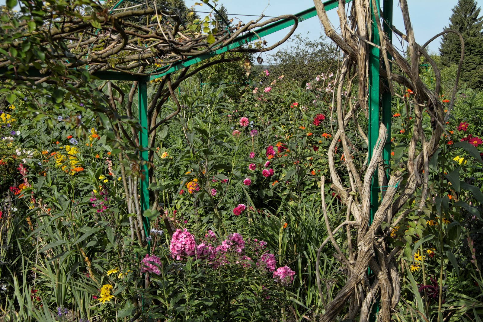 Perhaps because we'd taken the detour to Monet's bust there was a bit of queue at the entrance to the gardens but we eventually made it to the inside. The gardens were row after row of beautiful and colourful flowers of all different kinds. There were some structures with old looking creeping plants growing over them.