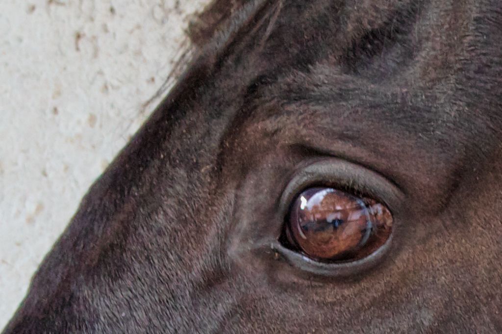 I was a bit intrigues by the catchlight in Rose's eye, so I went back to the original image and zoomed right in to get a close look. At 100% zoom you can clearly see the stable at the other side of the yard, the trees and sky above, then right in the centre there is me taking the photo. I was impressed with two things. The first was that Rose must have extremely clear, healthy eyes and secondly the new camera lens is amazing. I've not mentioned the demise of my old lens in the blog yet. If I ever get back up to speed I'll talk about it some time.