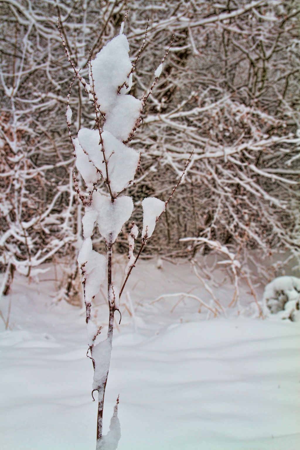 I'm not sure what kind of weed this is but I just loved the way the snow had built up on the remains of last year's folliage. The shape of the snow looks like white crystal strawberries.