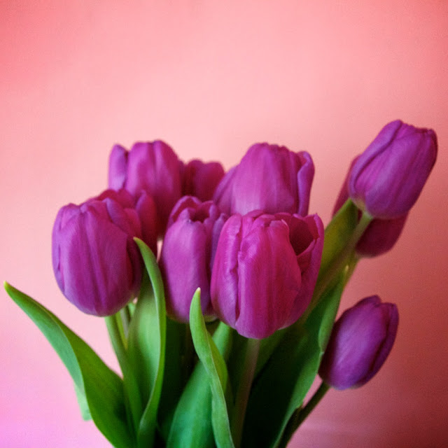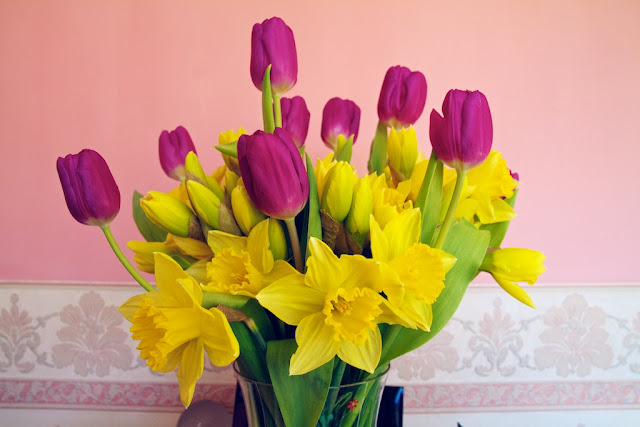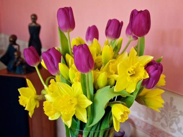 In the third photo there is a separate vase with just tulips which is on the top of one of my speakers in the corner of the lounge. There were lots of spare flowers which didn't fit into the first vase so there are some daffodils on their own too in the last photo of this post. This image also features a photo of my daughters from around twenty years ago in their pretty sailor dresses. That seems a very long time ago.