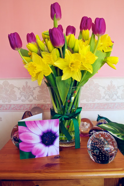 But for this post I have some photos I made of the flowers that my wife received for Mother's Day. The first photo is the main display with the mix of tulips and daffodils a couple of days after they arrived. When the flowers were first arranged none of the daffodils had opened so I waited until there were a few open but still mainly closed. This photo also includes the card that came with the flowers and some of the paperweights we have displayed in the lounge.