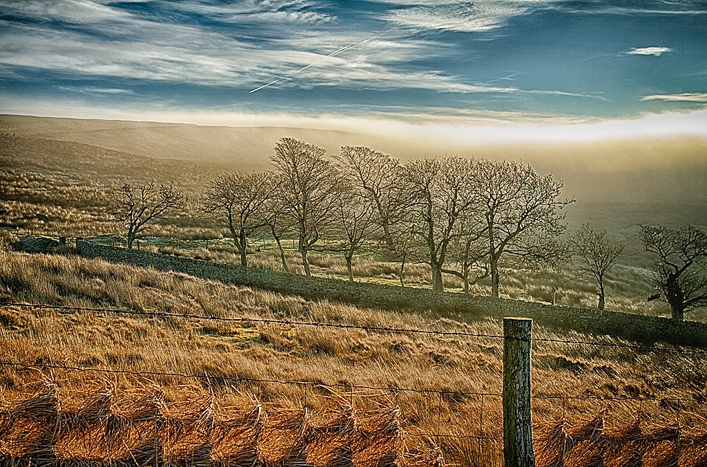 The cloud was quickly lifting and this shot was taken from the other side of the trees and show the grass being lit up with the yellow light of the sun.