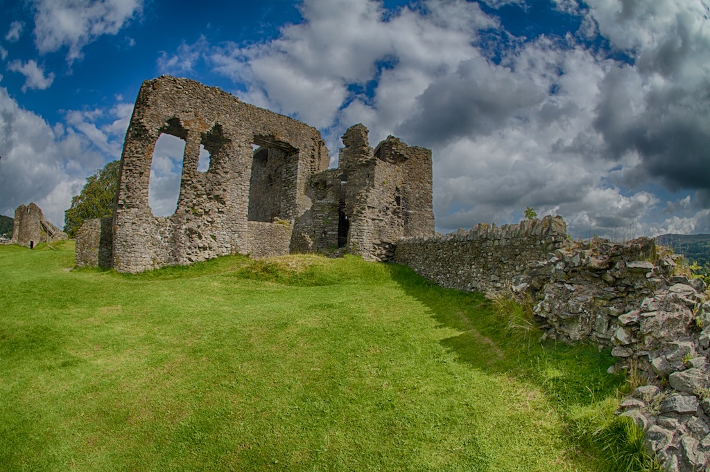 I wandered about the inside of the castle for a while taking photographs but the lack of any good light made them disappointing. Finally the sun came back out while I had my fish eye lens on the camera and I took this shot. I love using the fish eye for some landscape shots because it's possible to get really close to the subject but because of the wide angle the shot also includes a lot of the background. The distortion of the fish eye could be straightened out using software but I actually like how it curves the background around the subject.